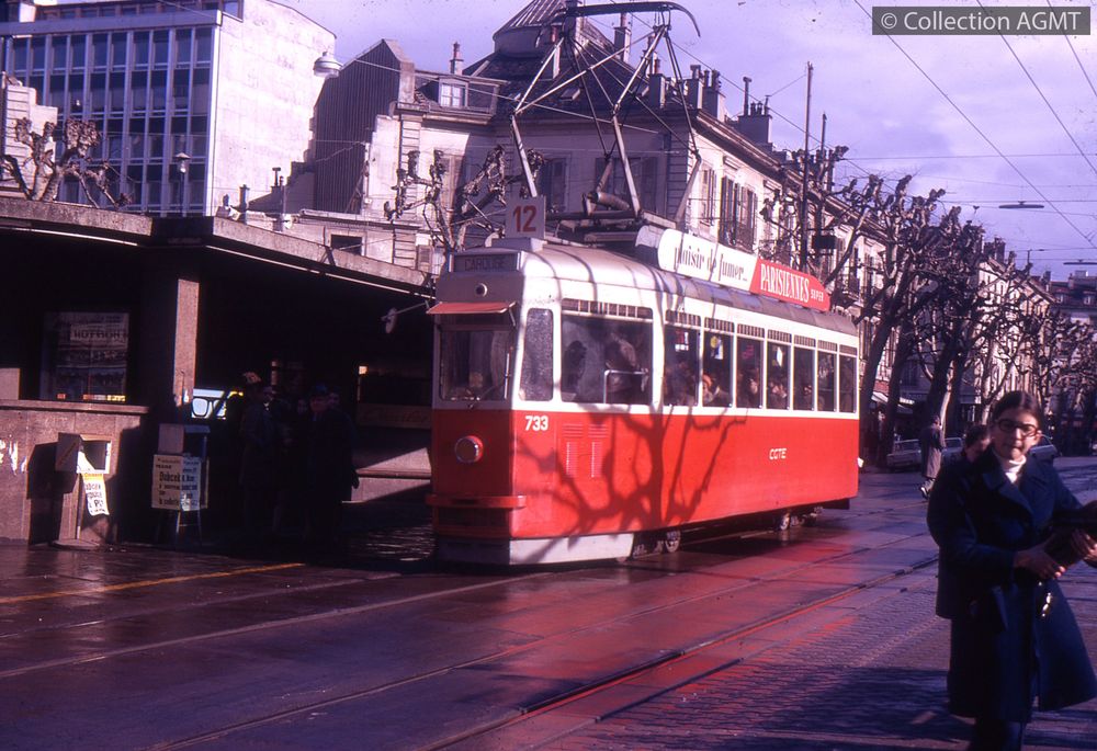 PermalinkEn service sur la ligne 12 à destination de Carouge, l'automotrice Ce 4/4 733 de la CGTE marque l'arrêt à Rive / Nicholas Edward Wiseman