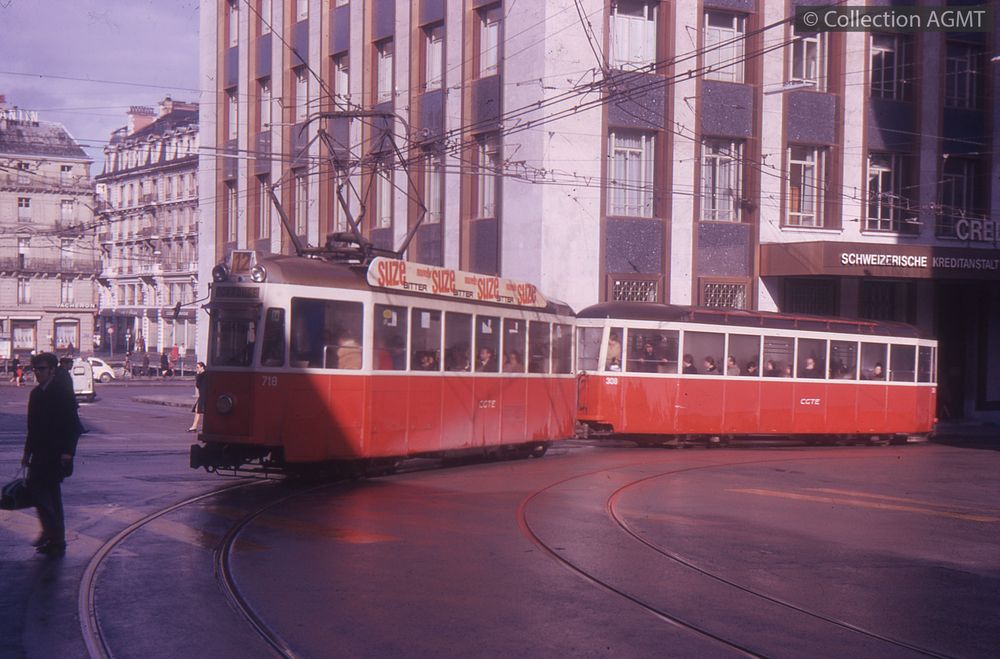 PermalinkEn service sur la ligne 12 à destination de Carouge, un convoi CGTE formé de l'automotrice 718 et de la remorque 308 s'engage dans la rue de la Corraterie / Nicholas Edward Wiseman