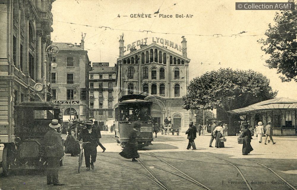 [Année] 1915Index. décimale : 3141 Tramway et métro léger urbain - véhicule - service régulier, transport de voyageur Genève : place Bel-Air [document graphique à deux dimensions] . - Neuchâtel : Phototypie, [ca 1915] . - 1 carte postale : noir et blanc ; 9 x 14 cm.
