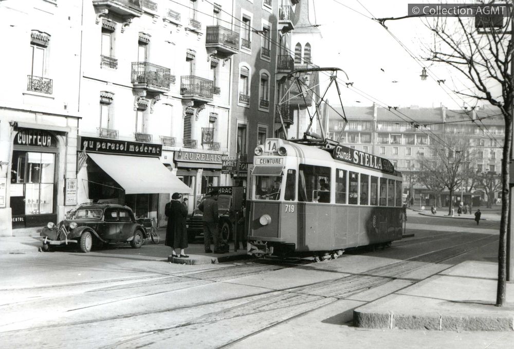 PermalinkPermalinkArrivant de la place des Eaux-Vives, l'automotrice 719, en service sur la ligne 1A, marque l'arrêt au carrefour de Rive / Jacques Bazin