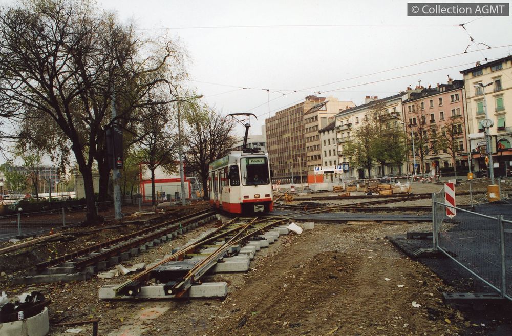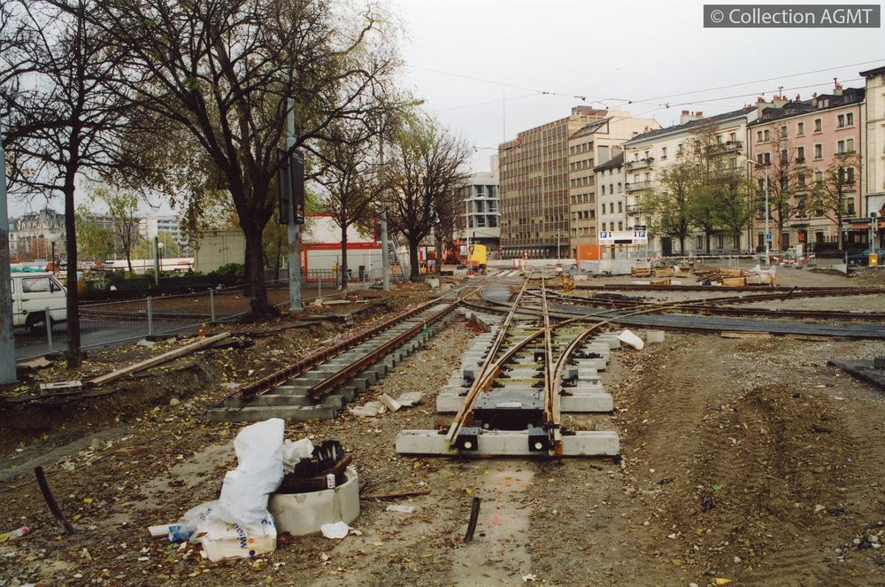 Au rond-point de Plainpalais, la nouvelle voie de la ligne 13 en direction de Cornavin est en construction, parallèlement à celle en service depuis 1995 |