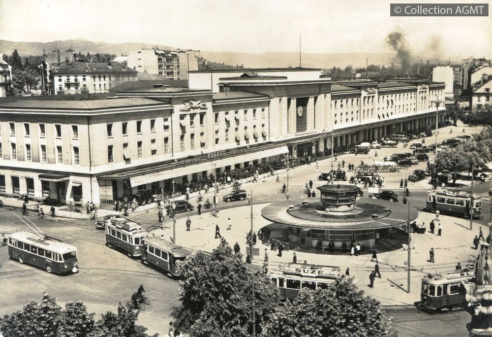 [Année] 1949Index. décimale : 3141 Tramway et métro léger urbain - véhicule - service régulier, transport de voyageur Genève : place et gare de Cornavin [document graphique à deux dimensions] . - Genève : Jaeger, [ca 1949] . - 1 carte postale : noir et blanc ; 11 x 15 cm.