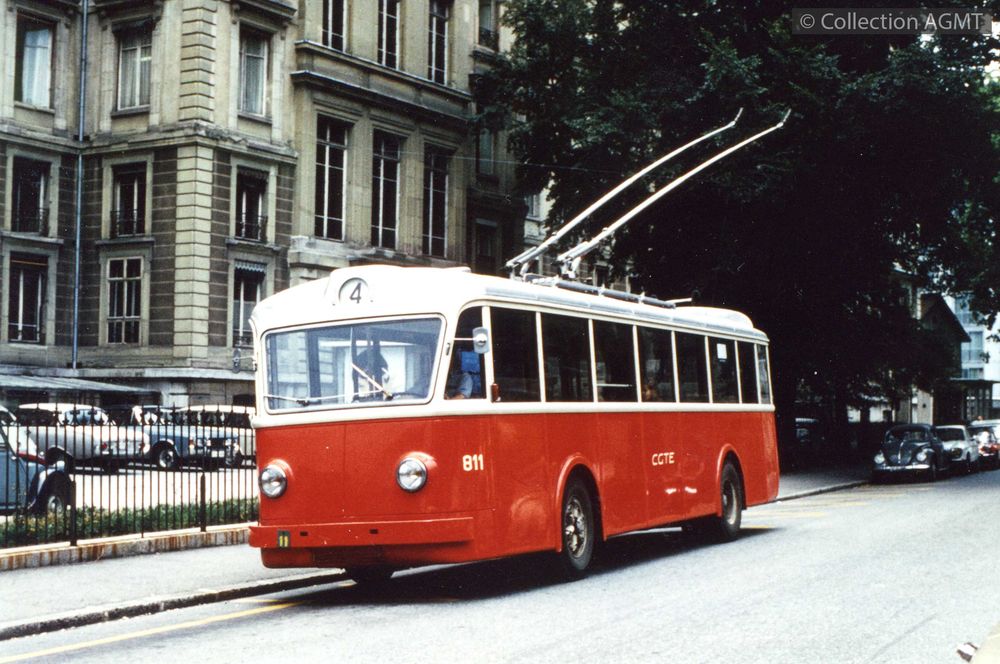 [Année] 1942-1992Résumé : Le trolleybus est apparu à Genève en 1942 sur la ligne 3 où il remplaçait le tramway. Par la suite, le réseau s'est étendu avec le remplacement d'autres lignes de tramway ou de bus. En 1971 et 1988, deux lignes de trolleybus ont été converties à l'exploitation par bus. La livrée des véhicules a évoluée: d'abord vert et crème, ils ont ensuite portés une livrée rouge et crème puis la livrée orange recommandée par l'UST. En 1976, le sigle change puisque la CGTE est remplacée par les TPG. Présentation chronologique de l'évolution du réseau et description des 10 séries de véhicules ayant composé le parc de la CGTE et composant celui des TPG. Au dépôt de la Jonction, deux trolleybus de la série 801-812 encadrent un véhicule racheté à Zurich / Peter Willen