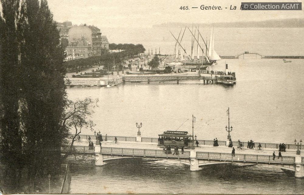 [Année] 1905Index. décimale : 3141 Tramway et métro léger urbain - véhicule - service régulier, transport de voyageur Genève : le pont du Mont-Blanc [document graphique à deux dimensions] . - Genève : B & Co, [ca 1905] . - 1 carte postale : sépia ; 9 x 14 cm. - (B & Co; 54) .