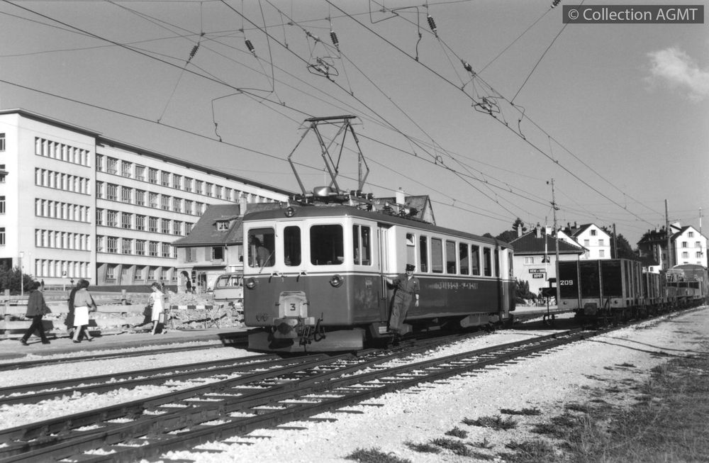 PermalinkEn gare de Ste-Croix, à côté d'une rame de wagons marchandises, l'automotrice 3 manoeuvre / Jacques Bazin