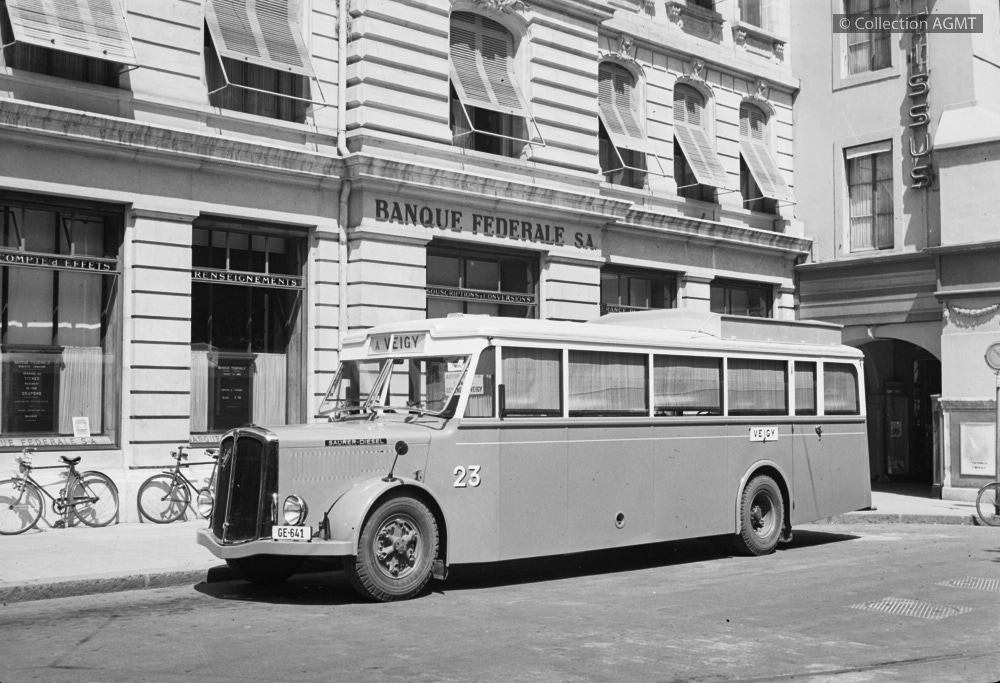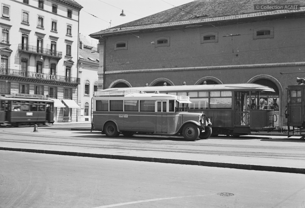 PermalinkGenève, place du Molard : en service sur la ligne A à destination de Veigy, l'autobus Saurer no 23 de la CGA attend l'heure du départ / Willy Boegli