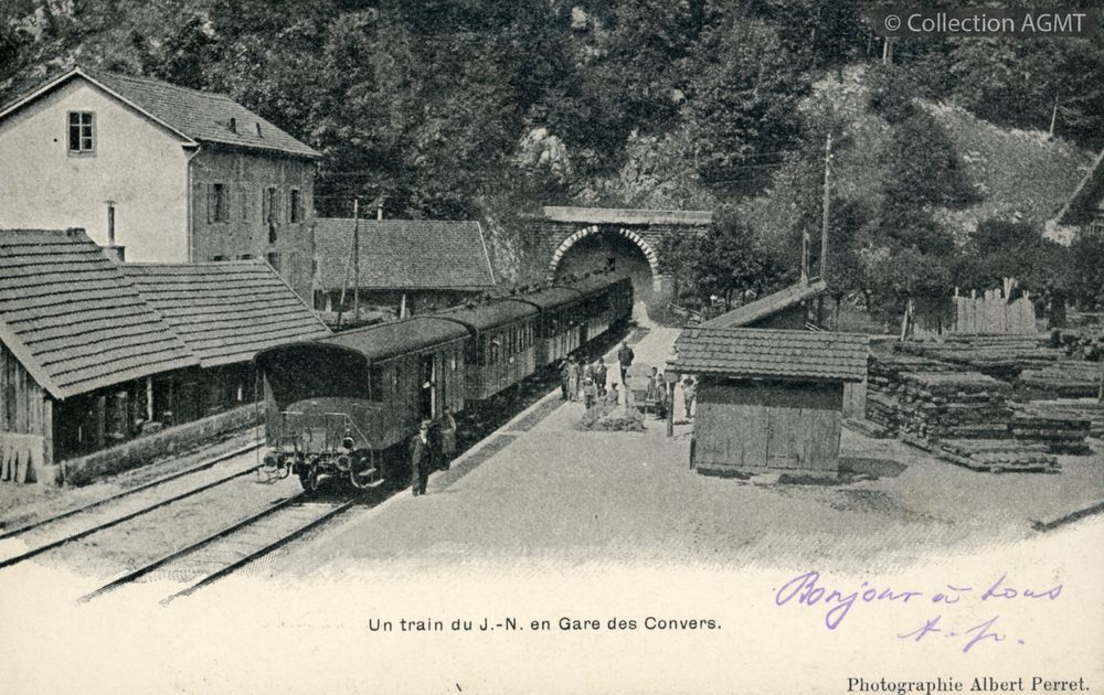 [Compagnie] JNIndex. décimale : 4341 Chemin de fer interurbain et vicinal - véhicule - service régulier, transport de voyageur Un train du JN en gare des Convers [document graphique à deux dimensions] / Albert Perret, Photographe . - [S.l.] : Photographie Albert Perret, [ca 1900] . - 1 carte postale : noir et blanc ; 9 x 14 cm.