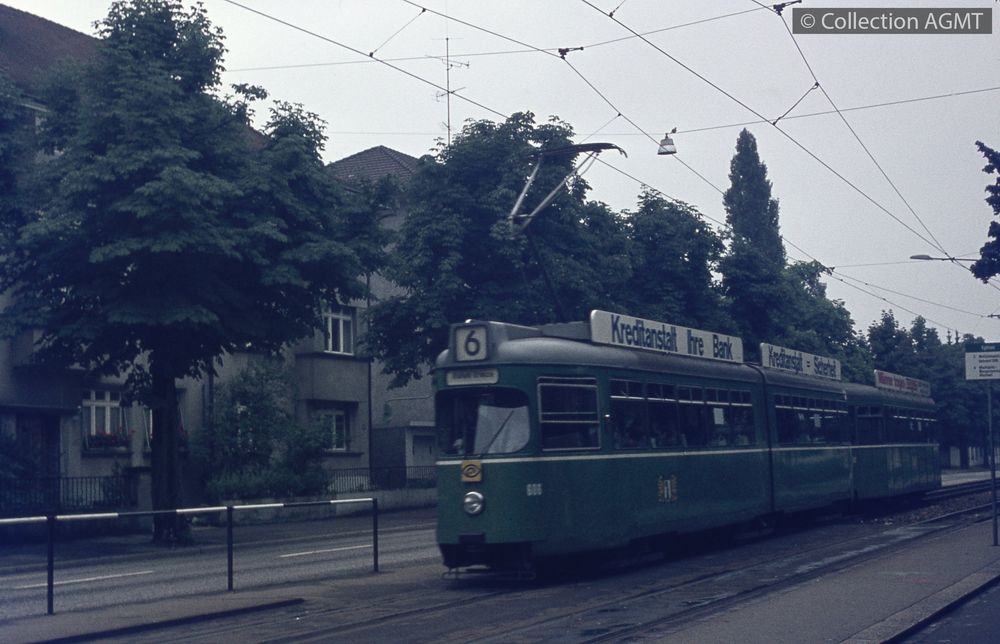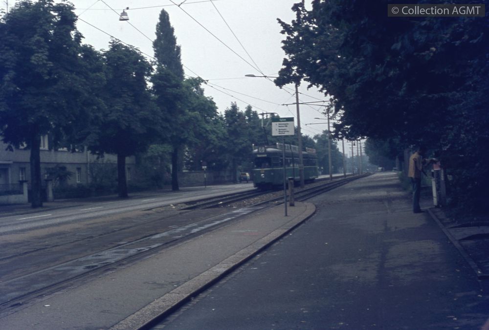 [Année] 1973Index. décimale : 3141 Tramway et métro léger urbain - véhicule - service régulier, transport de voyageur Bâle, Riehenstrasse : un convoi BVB de la ligne 6 à destination de Riehen Grenze, formé de l'automotrice Be 4/6 606 et d'une remorque arrive à l'arrêt "Eglisee" [document projeté ou vidéo] / Richard J.S. Wiseman, Photographe . - [S.l.] : Agfacolor, [ca 1973] . - 1 diapositive : couleur ; 5 x 5 cm.