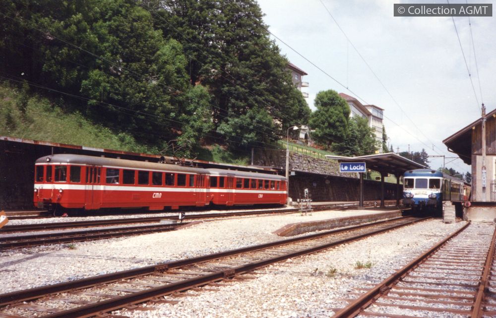 PermalinkUne rame réversible des CMN formé d'une automotrice et d'une voiture-pilote attend l'heure du départ en gare du Locle / Gaston Guignard