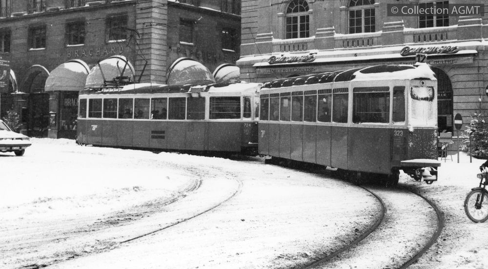 3149(494.42)_TPG_1988-51.jpgImage Jpeg PermalinkPermalinkPermalinkCirculant dans la neige en direction de Carouge, un convoi TPG de la ligne 12 formé de l'automotrice 724 et de la remorque 323 s'engage dans la rue de la Corraterie / Jeremy Wiseman