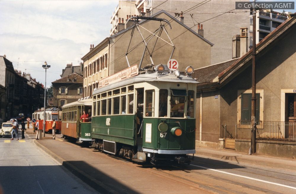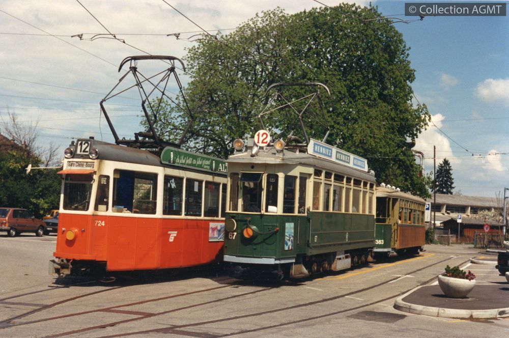 PermalinkLe convoi AGMT formé de l'automotrice 67 et de la remorque 363 stationne sur la voie centrale de la place de Neuve entre un convoi "Normalisé" des TPG mené par l'automotrice 724 et une DAV / Martin Schweizer