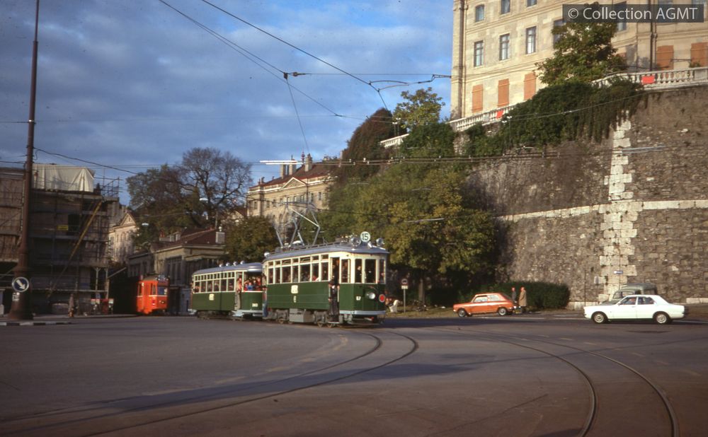 PermalinkLe convoi 724 + 308 en livrée intégralement orange UST débouche de la rue de la Corraterie sur la place de Neuve / Peter Sutter