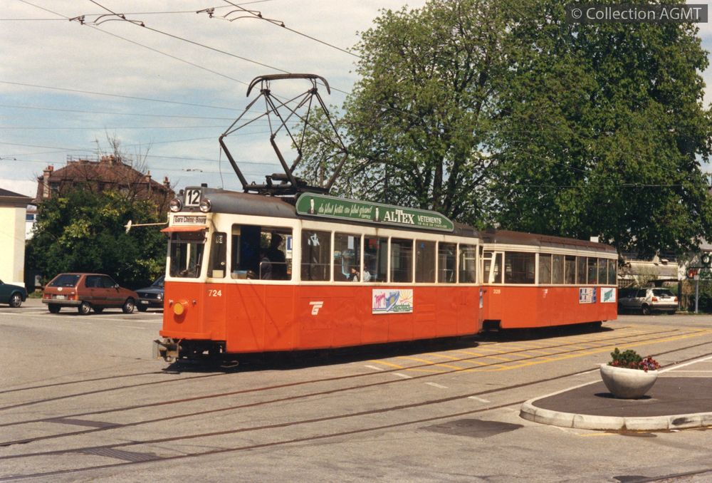 3149(494.42)_TPG_1988-50.jpgImage JpegAssurant une course spéciale pour le TMZ, un convoi TPG formé de l'automotrice 724 et de la remorque 328 stationne sur une voie de garage de la place de la Gare de Chêne-Bourg / Martin Schweizer