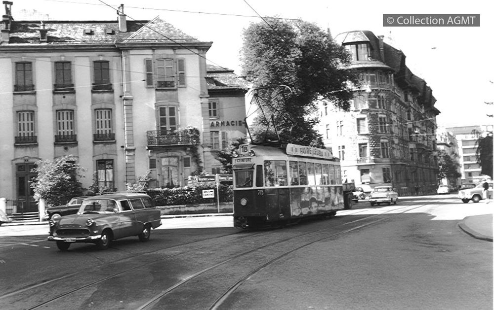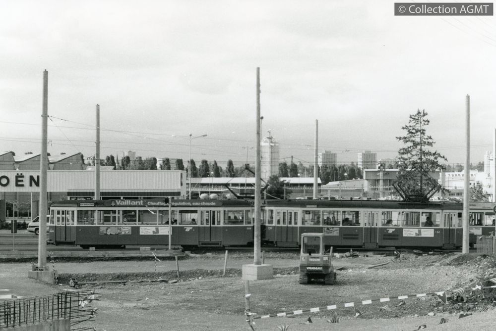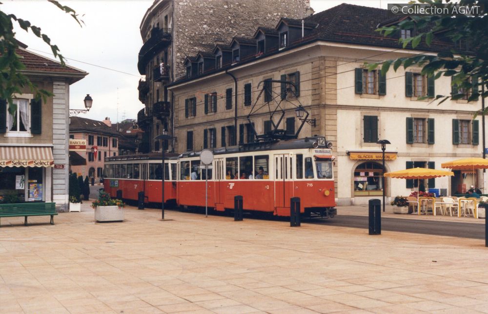 PermalinkUn convoi TPG de la ligne 12 à destination de Moillesulaz, formé de l'automotrice 715 et de la remorque 309, quitte l'arrêt De Staël où les voies d'accès au dépôt du Bachet ne sont pas encore construites / Jeremy Wiseman