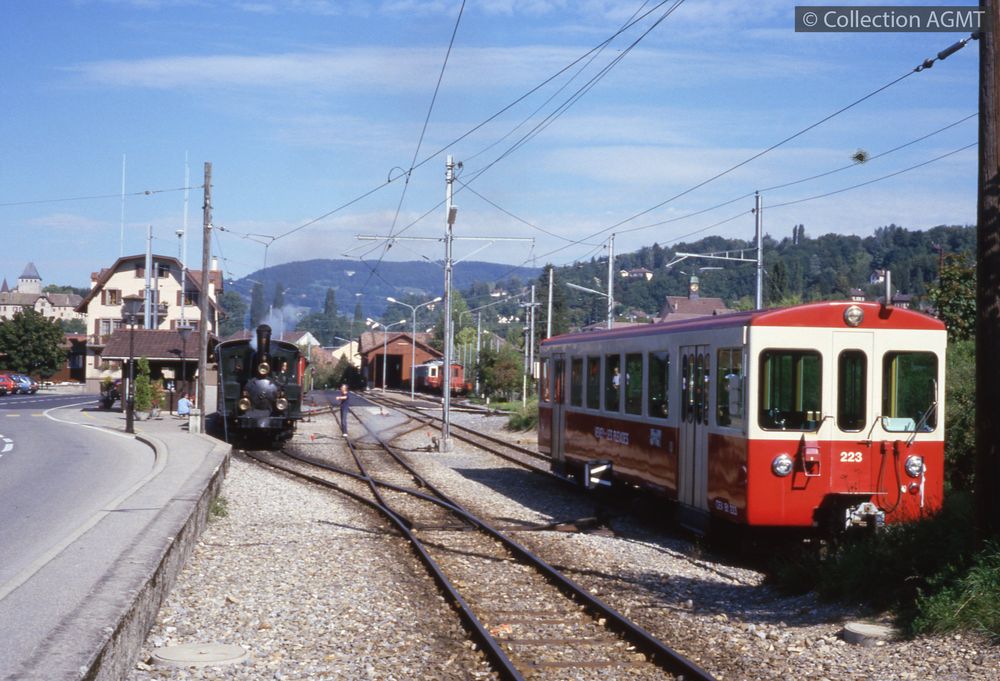 PermalinkPermalinkLa voiture pilote 223 des CEV stationne sur une voie de garage de la gare de Blonay ou la locomotive à vapeur "Bercher" du BC attend l'heure du départ pour Chamby / Jeremy Wiseman