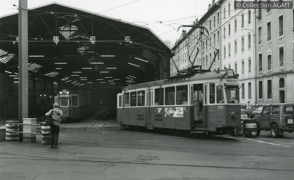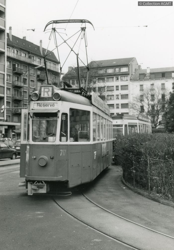 3148(494.42)_AGMT_1989-10.jpgImage JpegUn convoi CGTE de la ligne 12, formé de l'automotrice 717 et de la remorque 303, attend l'heure du départ pour Carouge au terminus de Moillesulaz / François Chapuis