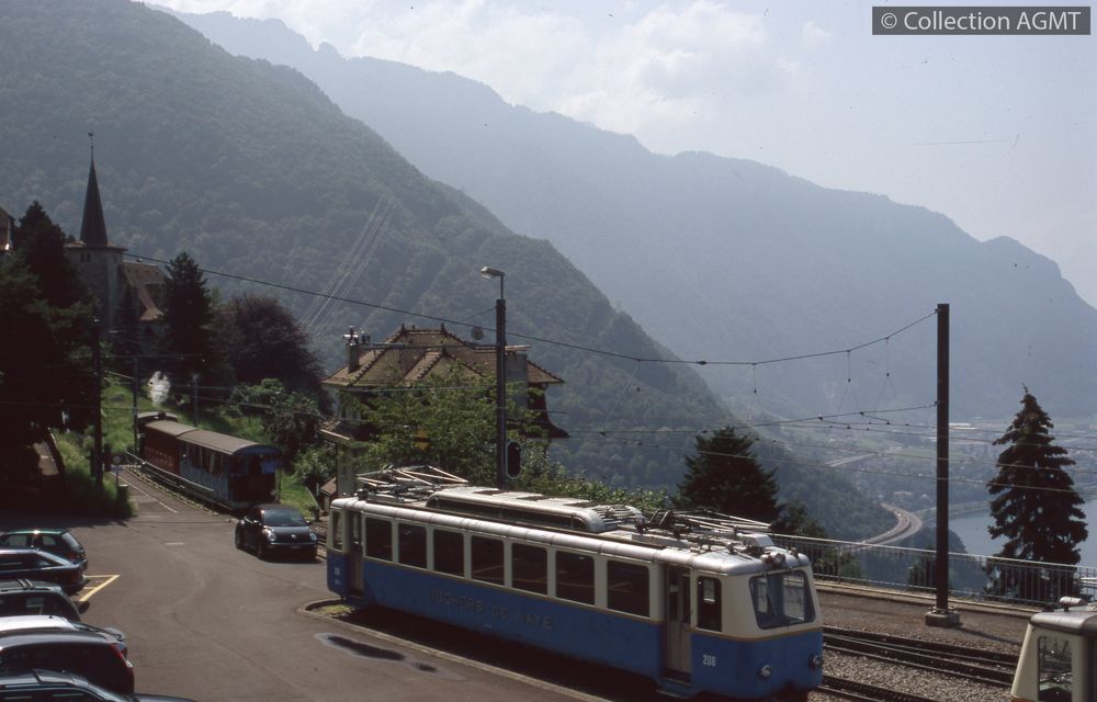 PermalinkPermalinkEn gare de Glion, l'automotrice ABhe 2/4 207 du GN stationne à côté d'un convoi du MGl formé de la locomotive HGe 2/2 3 et de la voiture B4 2 / Gaston Martin