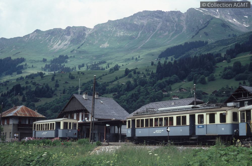 PermalinkL'automotrice ABFe 4/4 11 de l'ASD stationne au terminus des Diablerets en compagnie des voitures B2 31 et 35 / Jeremy Wiseman