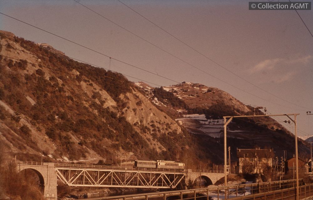 PermalinkUn convoi du LLB formé d'une automotrice et d'une voiture franchit le pont sur le Rhône à l'entrée de la gare de Loèche CFF / François Chapuis