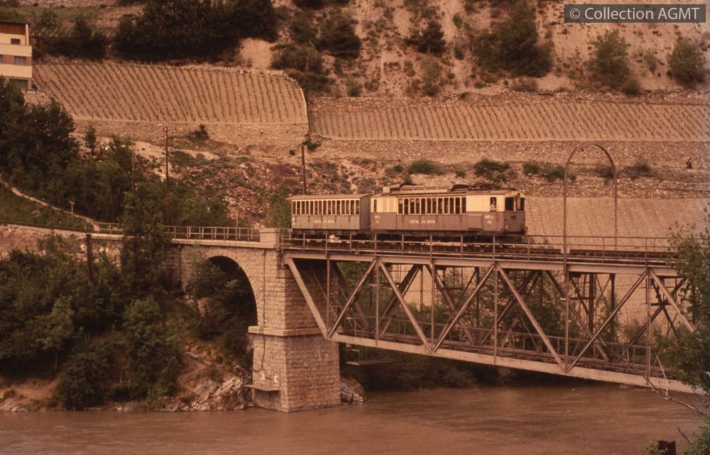 PermalinkPermalinkPermalinkUn convoi du LLB, formé de l'automotrice 10 et d'une voiture, franchit le pont sur le Rhône à l'entrée de la gare de Loèche CFF / François Chapuis