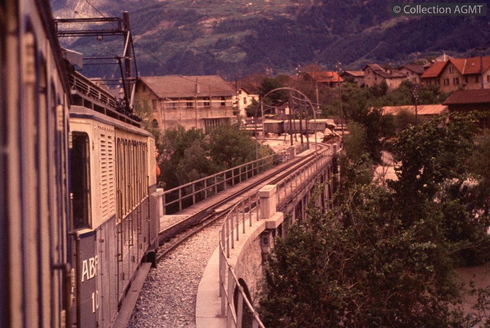 PermalinkUn convoi du LLB mené par l'automotrice 10 s'engage sur le pont sur le Rhône à l'entrée de la gare de Loèche-CFF / François Chapuis