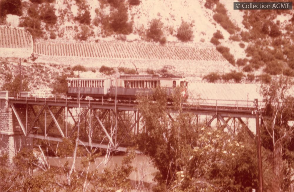 PermalinkUn convoi du LLB, pavoisé à l'occasion de la suppression de la ligne, franchit le pont sur le Rhône à l'entrée de la gare de Loèche CFF / Jean-Marc Bongni