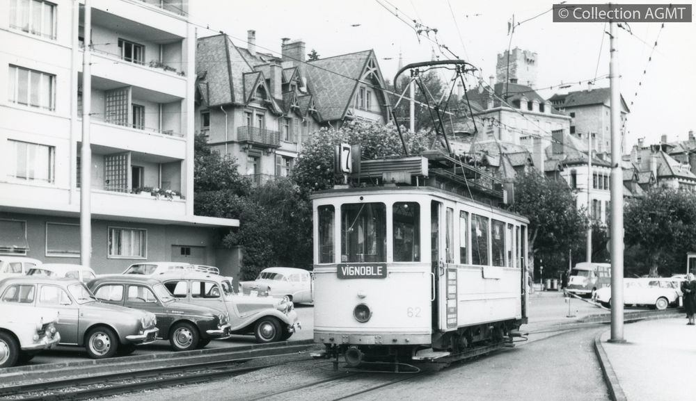 [Ligne] VignobleIndex. décimale : 3141 Tramway et métro léger urbain - véhicule - service régulier, transport de voyageur L'automotrice 62 des TN quitte le dépôt de l'Evole à destination du Vignoble [document graphique à deux dimensions] / Jeremy Wiseman (1933-2022), Photographe . - [S.l.] : [s.n.], [ca 1970] . - 1 photographie : noir et blanc ; 8 x 14 cm.