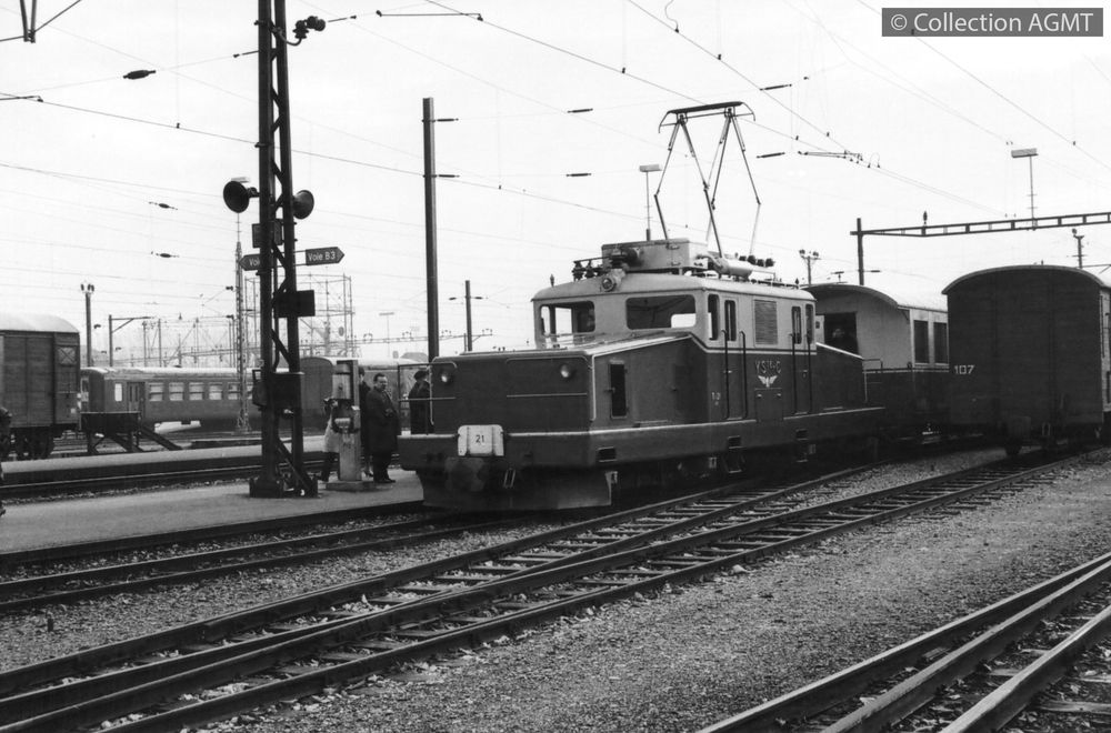 [Année] 1960Index. décimale : 4341 Chemin de fer interurbain et vicinal - véhicule - service régulier, transport de voyageur Chemin de fer d'Yverdon à Ste-Croix : locomotive Te 4/4 21 entrant en gare de Baulmes = Chemin de fer d'Yverdon à Ste-Croix : Einfahrt des Traktors Te 4/4 21 in die Station Baulmes [document graphique à deux dimensions] / Alfred Aebi, Photographe . - Yverdon : E. Minikus, [1974] . - 1 photo : noir et blanc ; 11 x 15 cm.
