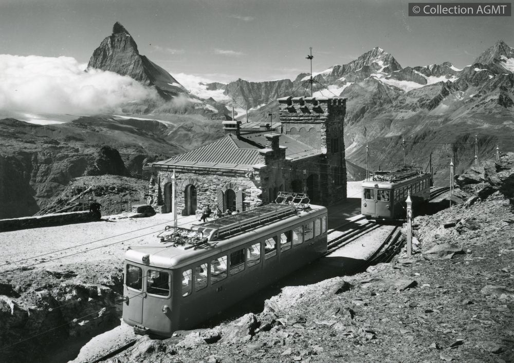 [Ligne] ZermattIndex. décimale : 4341 Chemin de fer interurbain et vicinal - véhicule - service régulier, transport de voyageur Bahnhof der Gornergratbahn m. Weisshorn [document graphique à deux dimensions] . - Zermatt : Photo "Matterhorn", [ca 1955] . - 1 carte postale : noir et blanc ; 9 x 14 cm. - (Photo "Matterhorn"; 901) .