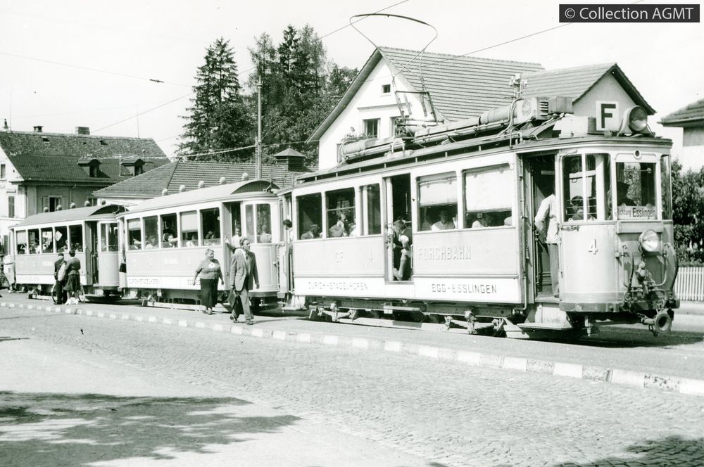 Affiner la recherche Interroger des sources externesUn convoi du FB à destination d'Esslingen, formé de l'automotrice 4 et de deux remorques, marque l'arrêt "Rehalp" / Richard J.S. Wiseman
