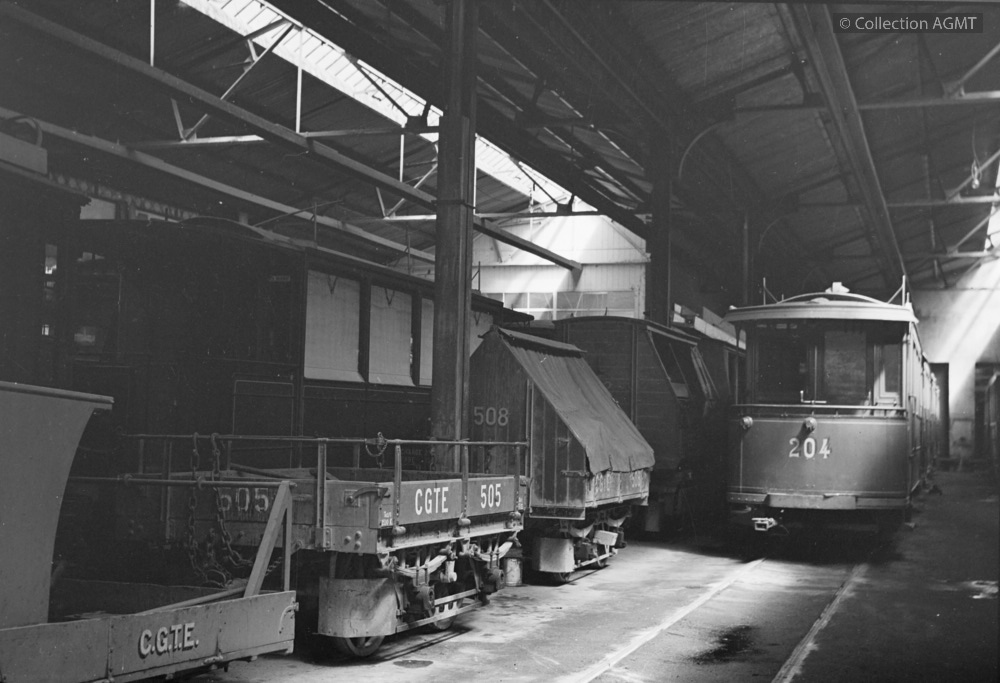 4145(494.42)_CGTE_1915-01_X1.jpgImage JpegVue d'une halle du dépôt CGTE de la Jonction où stationnent le wagonnet 505, le wagon à lait 508 et la remorque C2i 204 / Willy Boegli