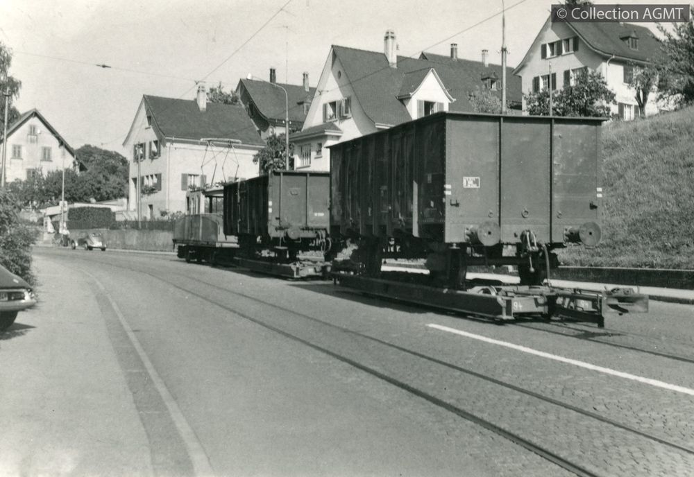 [Compagnie] VBSchIndex. décimale : 3145 Tramway et métro léger urbain - véhicule - service marchandises, postal, des manœuvres Convoi de deux wagons tombereau sur cadre porteur remorqué par la locomotive Ge 4/4 74 des VBSch [document graphique à deux dimensions] / Jeremy Wiseman (1933-2022), Photographe . - [S.l.] : [s.n.], [ca 1962] . - 1 photographie : noir et blanc ; 9 x 13 cm.