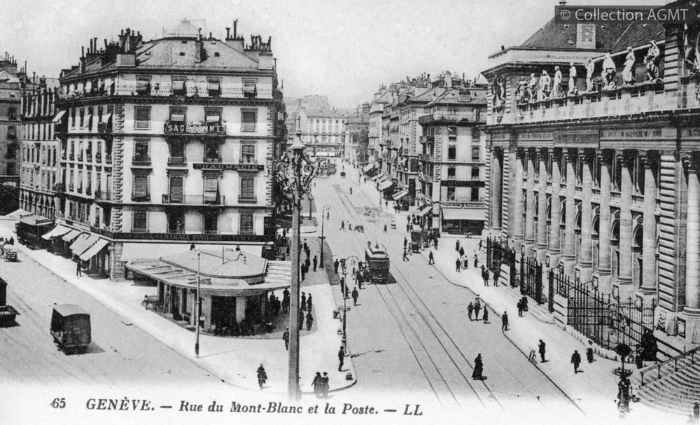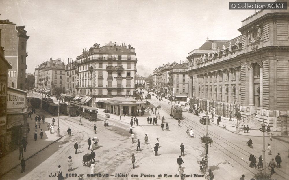 [Année] 1920Index. décimale : 3141 Tramway et métro léger urbain - véhicule - service régulier, transport de voyageur Genève : hôtel des Postes et rue du Mont-Blanc [document graphique à deux dimensions] . - Genève : Jullien frères, [ca 1920] . - 1 carte postale : noir et blanc ; 9 x 14 cm.