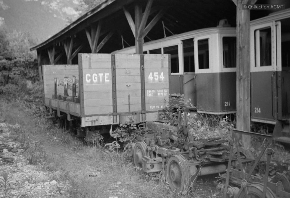 PermalinkPermalinkLes remorques C2 211 et 214 de la CGTE stationnent hors service au dépôt de Veyrier, en compagnie du wagon 454 et d'une paire de bogies porteurs / Willy Boegli