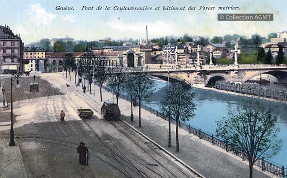 [Année] 1905Index. décimale : 4145 Tramway et métro léger interurbain et vicinal - véhicule - service marchandises, postal, des manoeuvres Genève : pont de la Coulouvrenière et bâtiment des forces motrices [document graphique à deux dimensions] . - Nyon : E. Rossier, [ca 1905] . - 1 carte postale : colorisée ; 9 x 14 cm. - (E. Rossier; S223) .