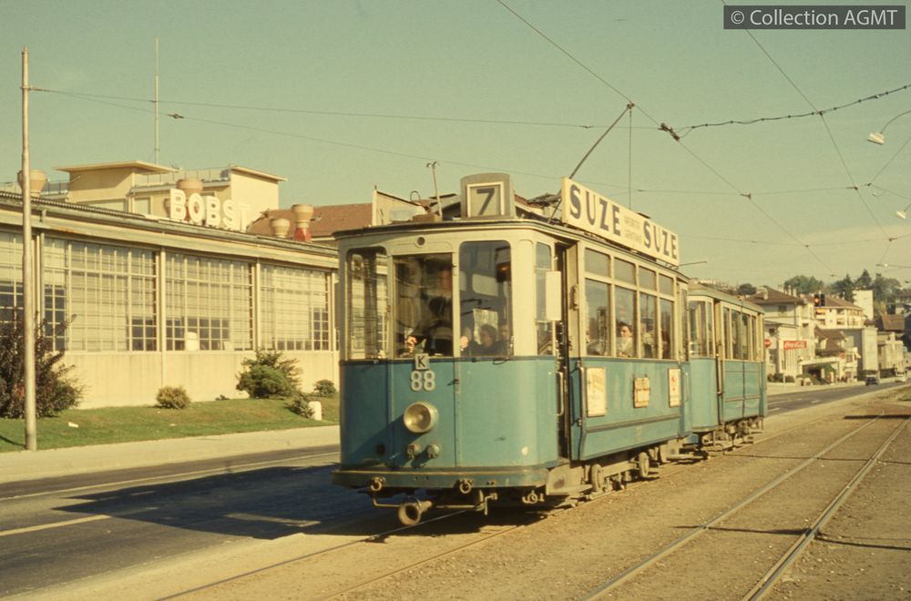 PermalinkMené par l'automotrice 88, un convoi TL de la ligne 7 passe devant l'usine Bobst à Prilly, route de Renens / Jeremy Wiseman