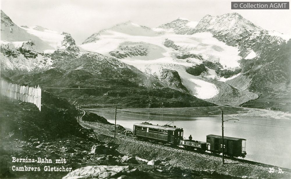 Die Bernina-Bahn bildet den hoechsten und schoensten Teil des Eisenbahnweges Deutschland - Schweiz - Italien via Engadin. Die Bernina-Bahn fuehrt nicht im Tunnel durch, sondern frei ueber den herrlichsten Teil des Graubuendner Hochgebirges. Jahres-Betrieb, Schnellzugsverkehr mit Salon- und Speisewagen.