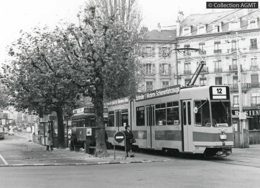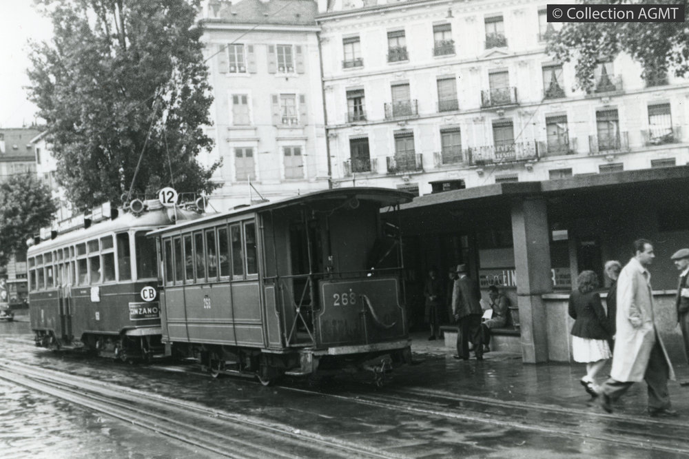 PermalinkUn convoi CGTE de la ligne 12 en provenance de Chêne-Bourg, formé d'une "plateforme centrale" et de la remorque 268, ex-VE, marque l'arrêt à Rive / Karl Wyrsch