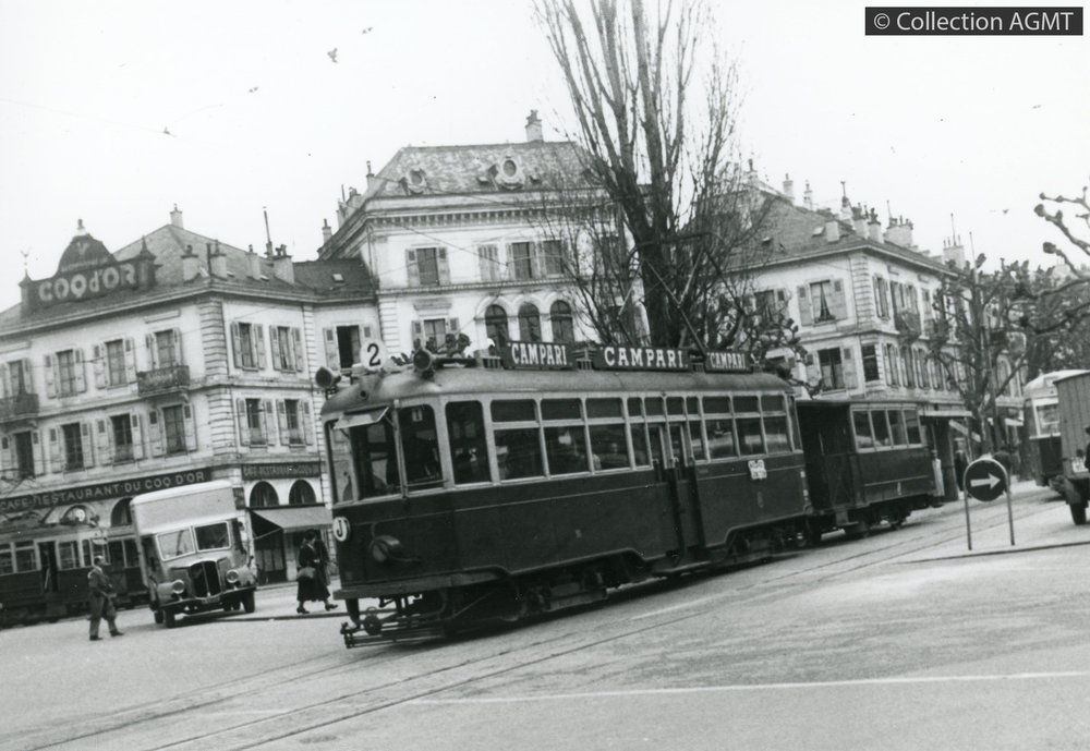 3141(494.42)_CGTE_1949-46.jpgImage JpegUn convoi CGTE de la ligne 12 en provenance de Chêne-Bourg, formé d'une "plateforme centrale" et de la remorque 268, ex-VE, marque l'arrêt à Rive / Karl Wyrsch