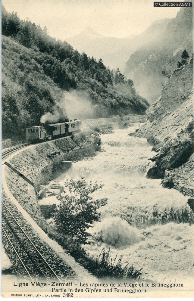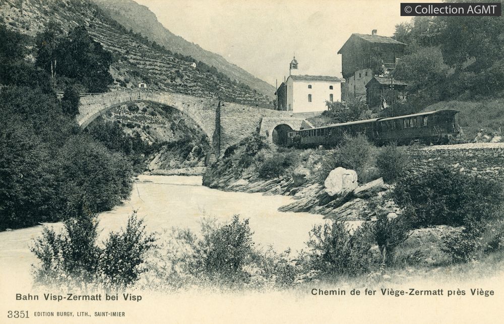 [Ligne] ZermattIndex. décimale : 4341 Chemin de fer interurbain et vicinal - véhicule - service régulier, transport de voyageur Bahn Visp-Zermatt bei Randa mit Breithorn = Ligne Viège-Zermatt, Randa, Breithorn [document graphique à deux dimensions] . - Saint-Imier : Edition Burgy, Lith., [ca 1895] . - 1 carte postale : colorisée ; 9 x 14 cm. - (Burgy; 3362) .
