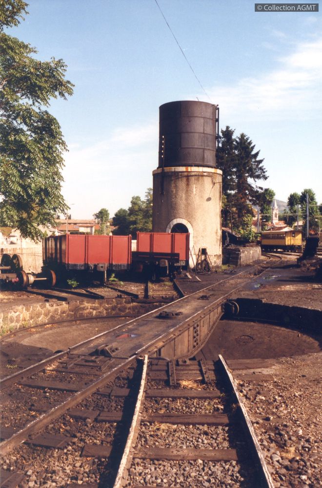 PermalinkDeux wagons tombereau des CFV stationnent sur les voies de garage desservies par le pont tournant, au pied du château d'eau du dépôt de Tournon / Gaston Guignard