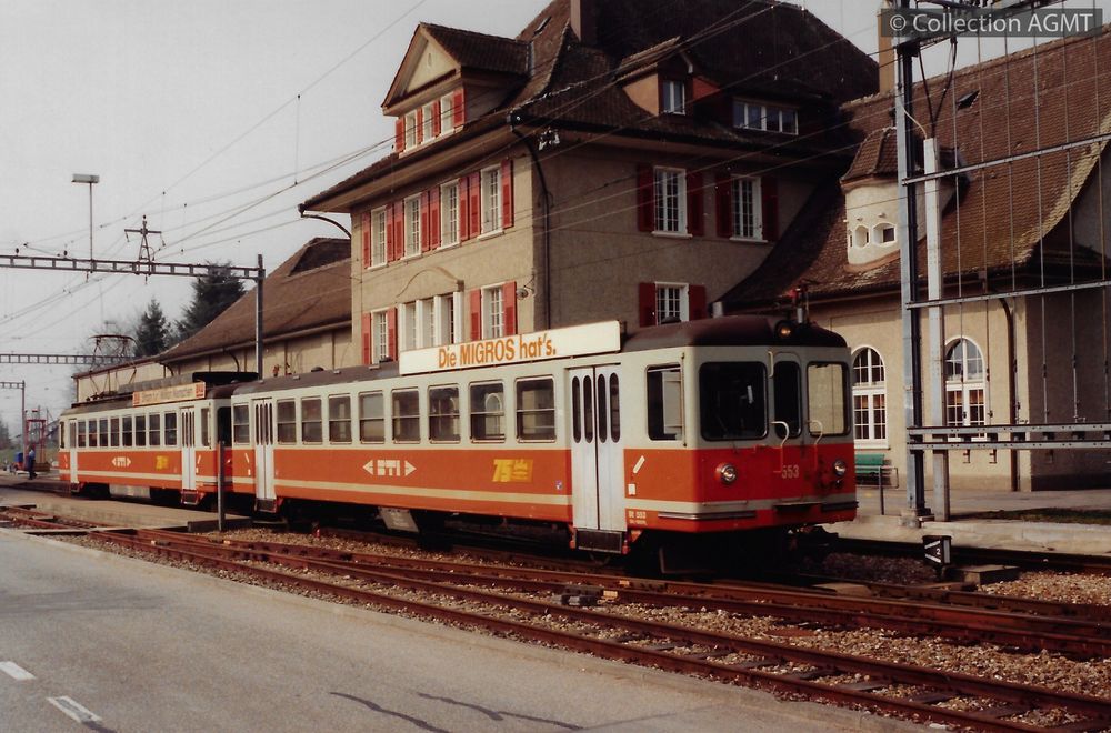 PermalinkUne rame réversible du BTI, formée d'une automotrice Be 4/4 et de la voiture-pilote Bt 553 marque l'arrêt en gare de Taeuffelen / Gaston Guignard
