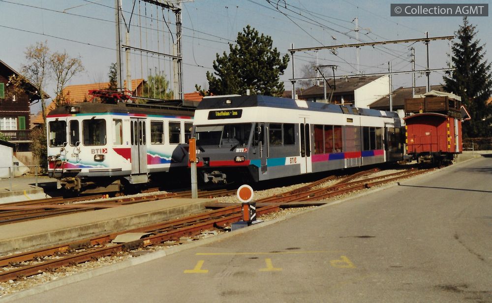 PermalinkUne rame réversible du BTI, formée de l'automotrice Be 4/4 525 et d'une voiture-pilote, stationne sur une voie de garage en gare de Taeuffelen / Gaston Guignard