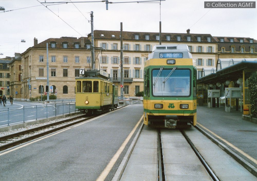 4341(494.24)_BTI_1989-03.jpgImage JpegLe convoi ANAT formé de l'automotrice 73 et de la remorque 1 attend ses voyageurs au terminus de la place Pury, à côté d'un convoi TN de la ligne 5 pour Boudry / Jeremy Wiseman