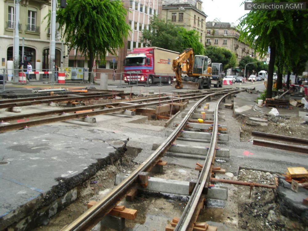 [Année] 2010Index. décimale : 3124 Tramway et métro léger urbain - infrastructure, ouvrage d'art, superstructure, énergie - entretien, réparation, renouvellement de la voie, modification du plan de voie Au bas de la rue de la Corraterie, les croisements entre les voies de la place Bel-Air et celles de la rue du Stand sont en cours de pose [document graphique à deux dimensions] / Cédric Noir, Photographe . - Genève : Migros, 2012 . - 1 photographie : couleur ; 9 x 12 cm.