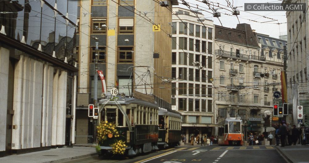 PermalinkPermalinkDécoré de rubans et de fleurs à l'occasion des festivités d'inauguration de la ligne 16 des TPG, le convoi 67-363 de l'AGMT s'engage dans la rue du Stand en direction de la place de Hollande / Richard J.S. Wiseman