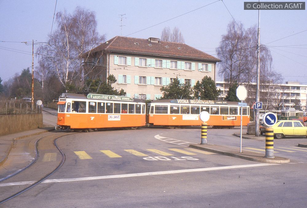 3149(494.42)_TPG_1987-09_d.jpgImage JpegEn service sur la ligne 12, un convoi TPG formé de l'automotrice 724 et de la remorque 325 parcourt la boucle de rebroussement de Moillesulaz / Jeremy Wiseman