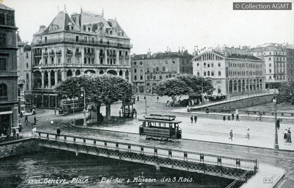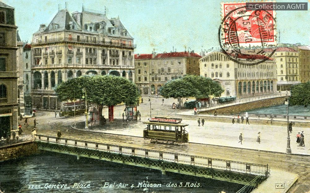 [Année] 1905Index. décimale : 3141 Tramway et métro léger urbain - véhicule - service régulier, transport de voyageur Genève : place Bel-Air + maison des 3 Rois [document graphique à deux dimensions] . - Paris : Aqua photo, [ca 1905] . - 1 carte postale : colorisée ; 9 x 14 cm.