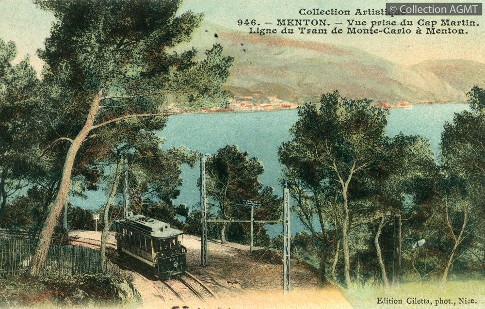 [Ligne] Monte CarloIndex. décimale : 4141 Tramway et métro léger interurbain et vicinal - véhicule - service régulier, transport de voyageur Menton : vue prise du Cap Martin : ligne du tram de Monte-Carlo à Menton [document graphique à deux dimensions] . - Nice : Edition Giletta, [ca 1903] . - 1 carte postale : colorisée ; 9 x 14 cm. - (Giletta; 946) .
