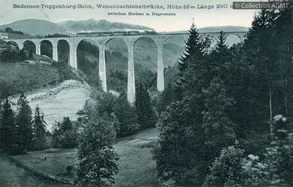 [Année] 1910Index. décimale : 4323 Chemin de fer interurbain et vicinal - infrastructure, ouvrage d'art, superstructure, énergie - construction de l'infrastructure, infrastructure en service Bodensee-Toggenburg-Bahn : Weisenbachtobelbruecke, Hoehe 60 m., Laenge 290 m., zwischen Herisau u. Degersheim [document graphique à deux dimensions] . - Basel : G. Metz, [ca 1910] . - 1 carte postale : noir et blanc ; 9 x 14 cm.